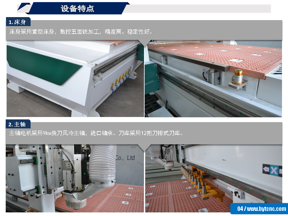 2. 主軸: 主軸電機采用9kw換刀風冷主軸,進口軸承。刀庫采用12把刀排式刀庫。