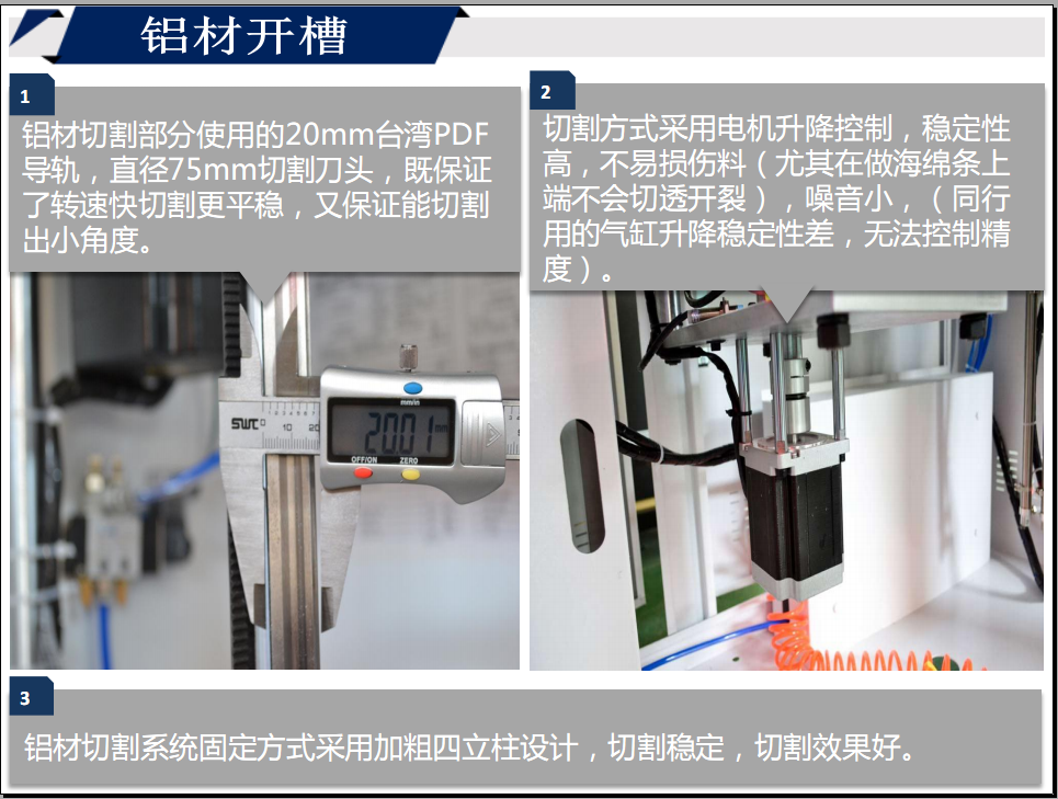 1.鋁材切割部分使用的20mm臺灣PDF導軌,直徑75mm切割刀頭,既保證了轉速快切割更平穩,又保證能切割出小角度。