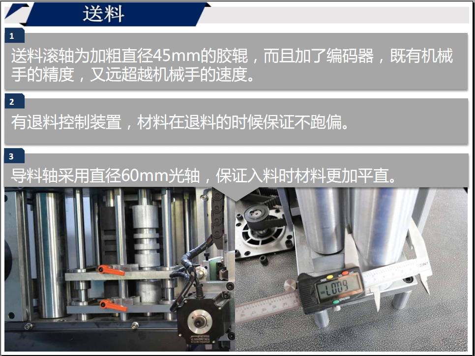1、送料滾軸為加粗直徑45mm的膠輥,而且加了編碼器,既有機械手的精度,又遠超越機械手的速度。
