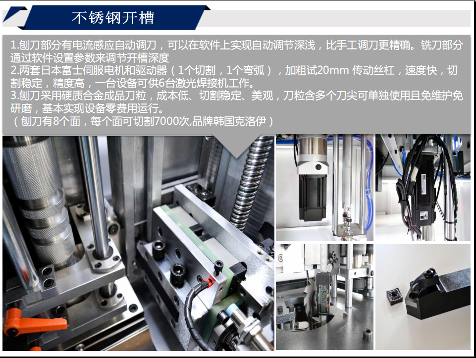 2.兩套日本富士伺服電機和驅動器(1個切割,1個彎弧),加粗試20mm 傳動絲杠,速度快,切割穩定,精度高,一臺設備可供6臺激光焊接機工作。