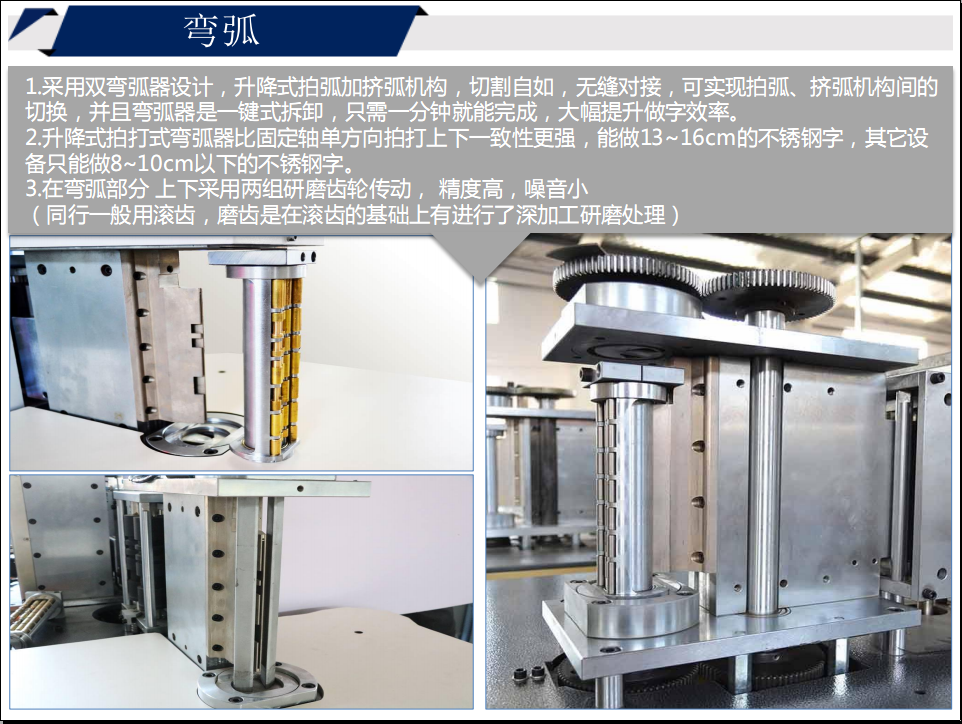 1. 采用雙彎弧器設計,升降式拍弧加擠弧機構,切割自如,無縫對接,可實現拍弧、擠弧機構間的切換,并且彎弧器是一鍵式拆卸,只需一分鐘就能完成,大幅提升做字效率。